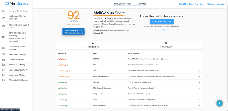 Gives ability to MailGenius users to audit their emails and get results on how likely the email will be delivered to a recepient.